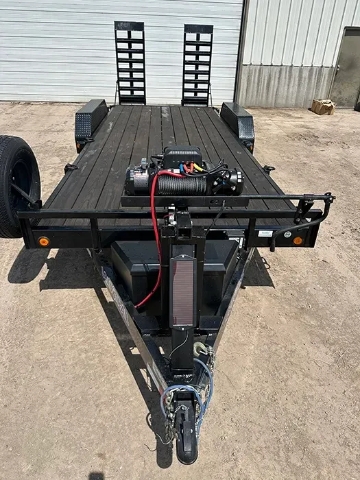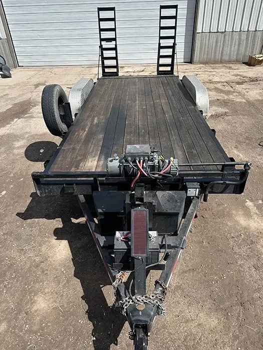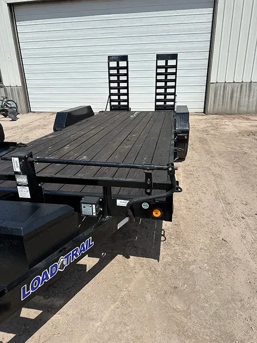 A heavy-duty 20-foot Load Trail car hauler built for bigger jobs, featuring a powerful winch, straps, wheel chocks, and spare tire to keep your haul secure on Idaho roads.